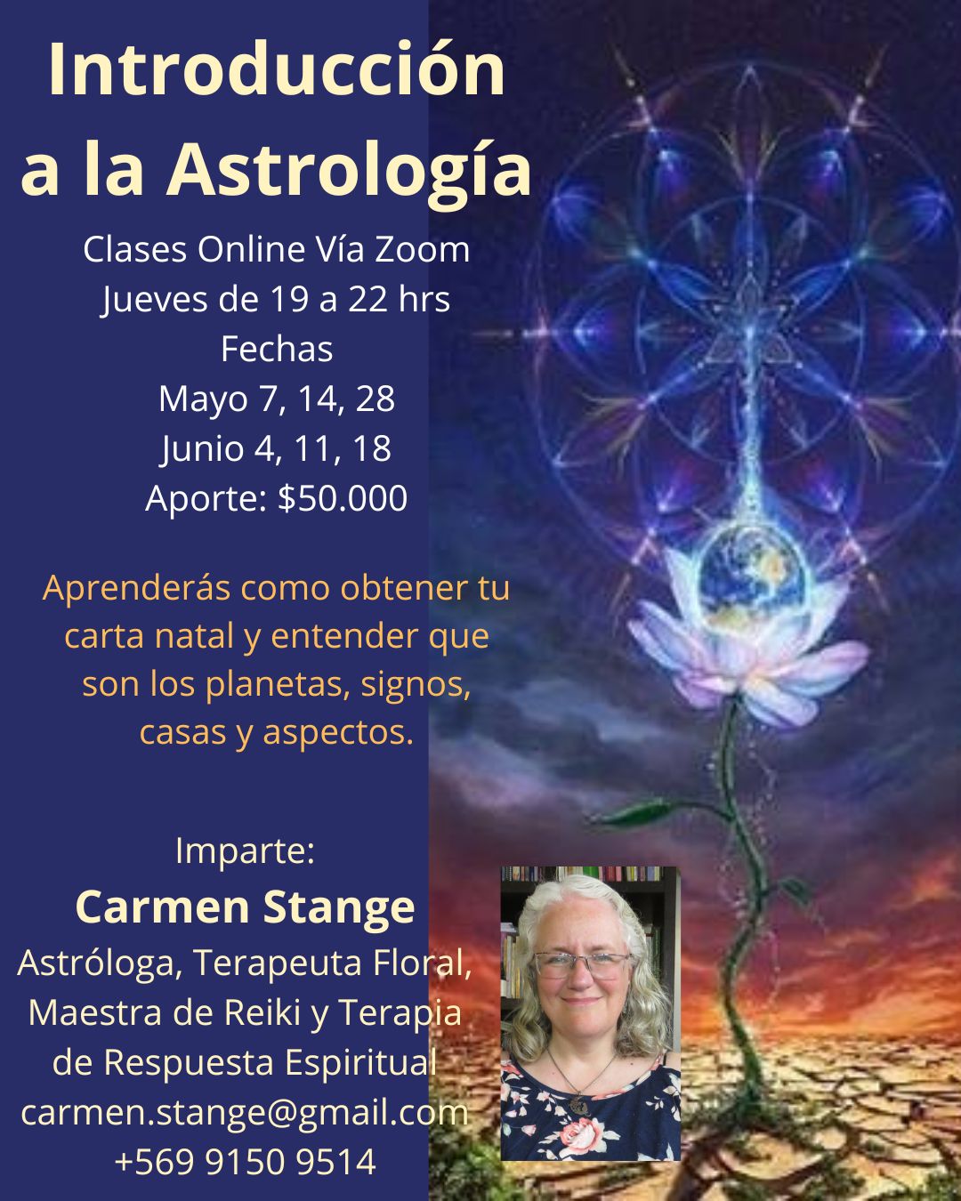 Carta Astral: a través de la sincronicidad en el universo, el momento del nacimiento nos muestra un mapa del plan de vida de la persona, sus fortalezas, sus debilidades y las lecciones a aprender. La información que contiene la carta es simbólica y el arte de leerla ayuda descubrir como aprovechar mejor los propios recursos y que partes necesitan ayuda para poder fortalecerlas.